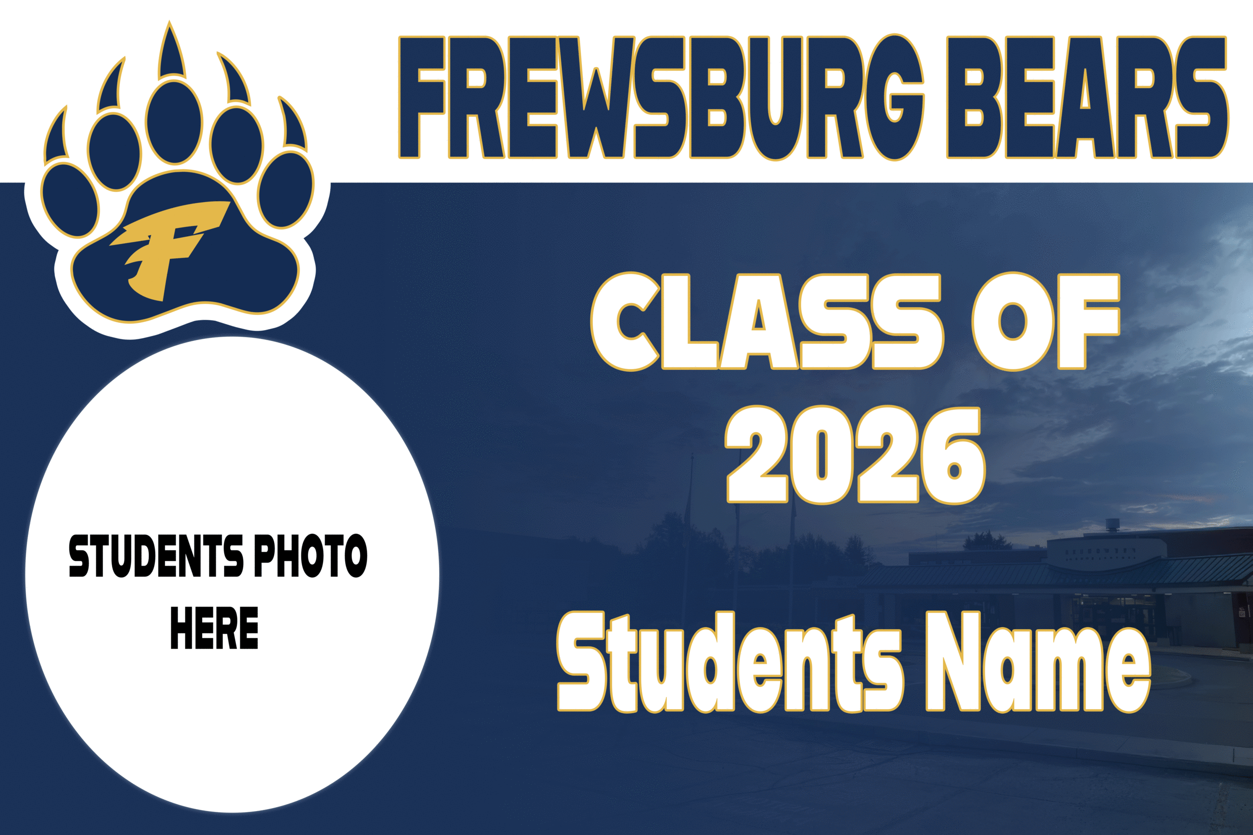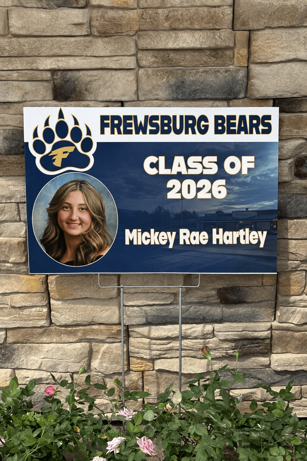 Celebrate your grad with a custom yard sign featuring their photo and name in Frewsburg Bears colors. Each sign is professionally printed and includes a wire stake, ready to display in your yard, at the school, or at graduation parties.