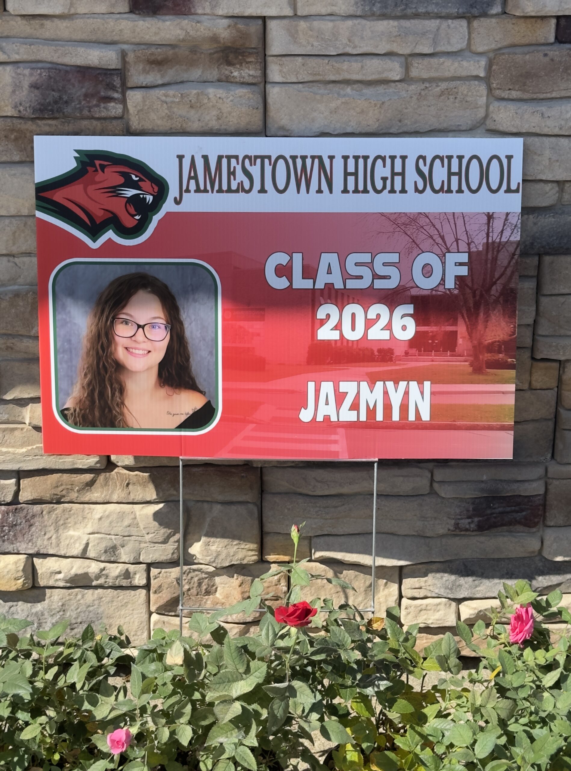 These custom graduation yard signs are made right here locally by Mags Custom and printed specifically for Jamestown High School Class of 2026. Every sign features your graduate’s photo and name on a bold, full-color design in Southwestern school colors.