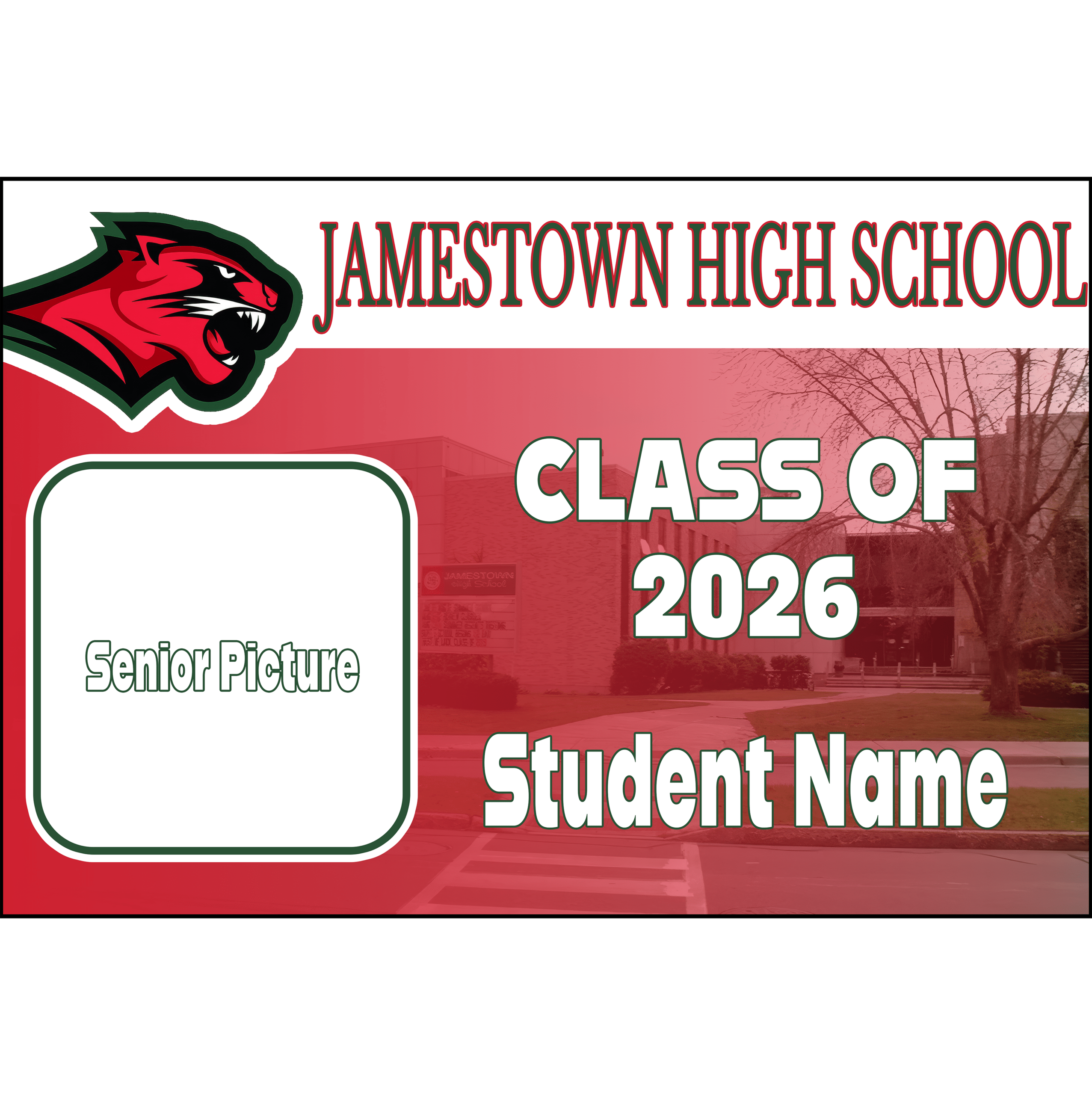 Celebrate your grad with a custom yard sign featuring their photo and name in JHS colors. Each sign is professionally printed and includes a wire stake, ready to display in your yard, at the school, or at graduation parties.