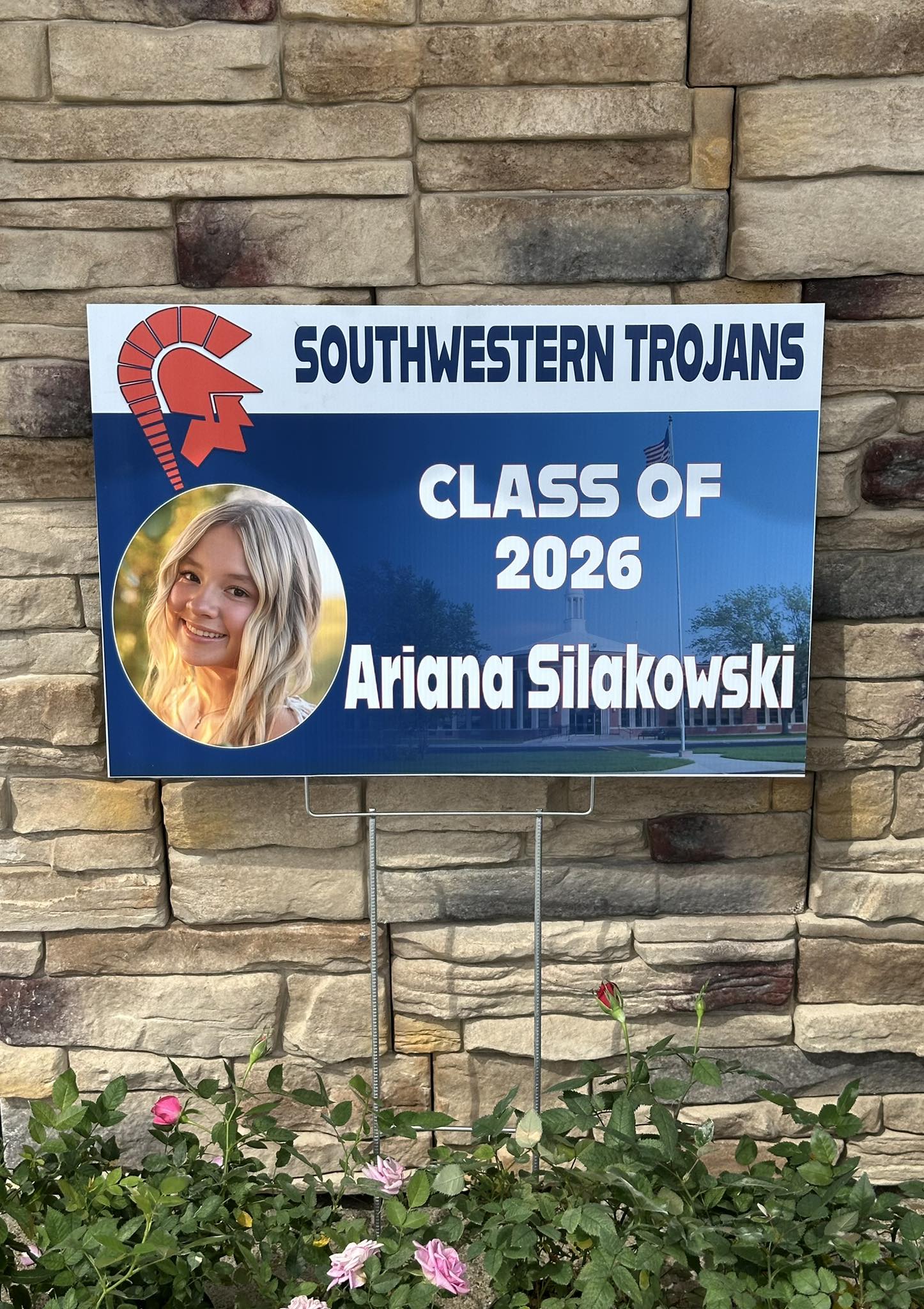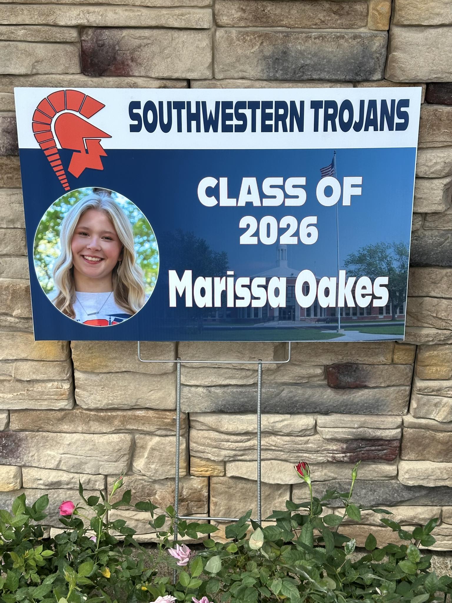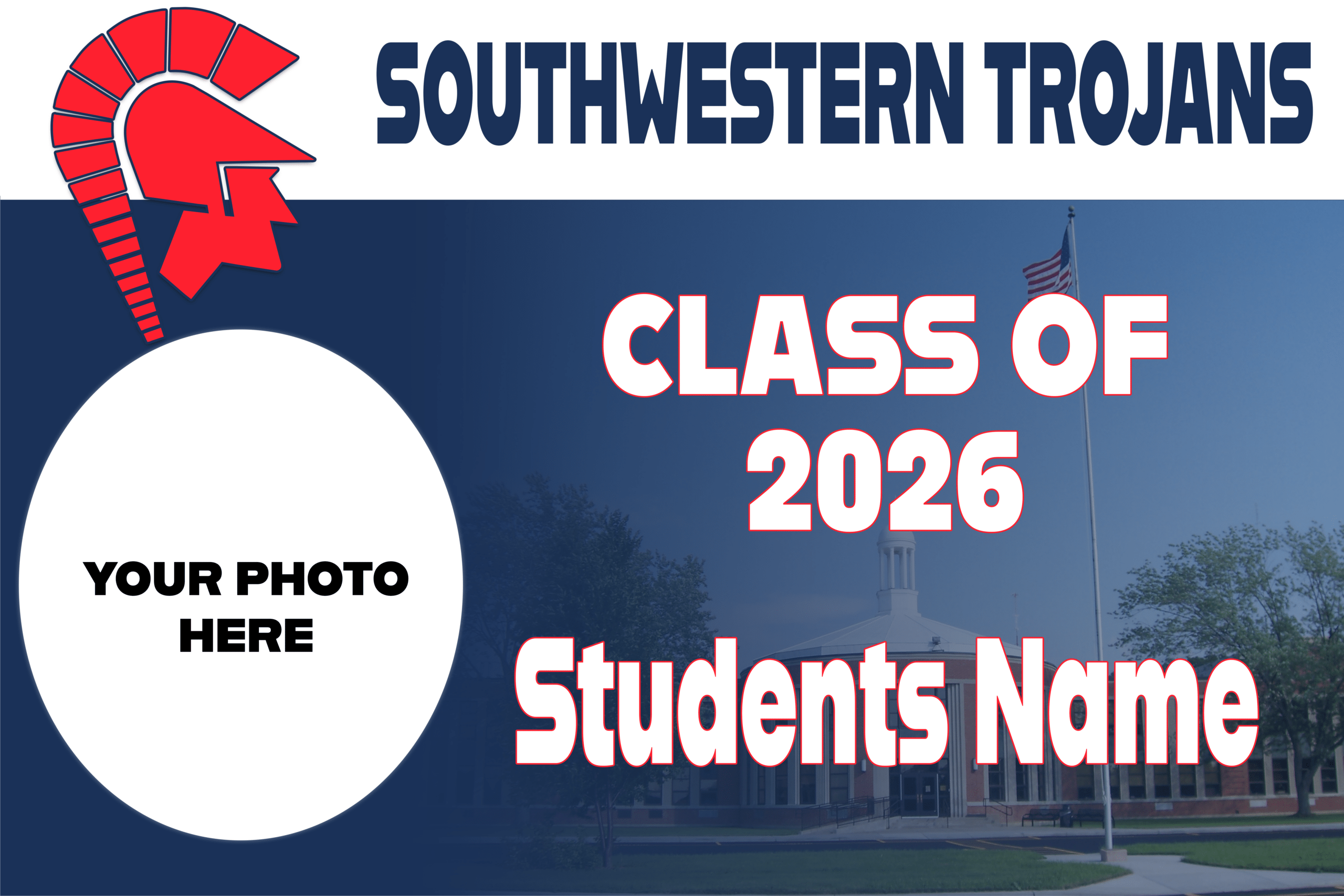 These custom graduation yard signs are made right here locally by Mags Custom and printed specifically for Southwestern Trojans Class of 2026. Every sign features your graduate’s photo and name on a bold, full-color design in Southwestern school colors.